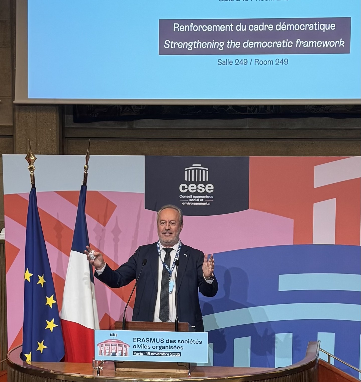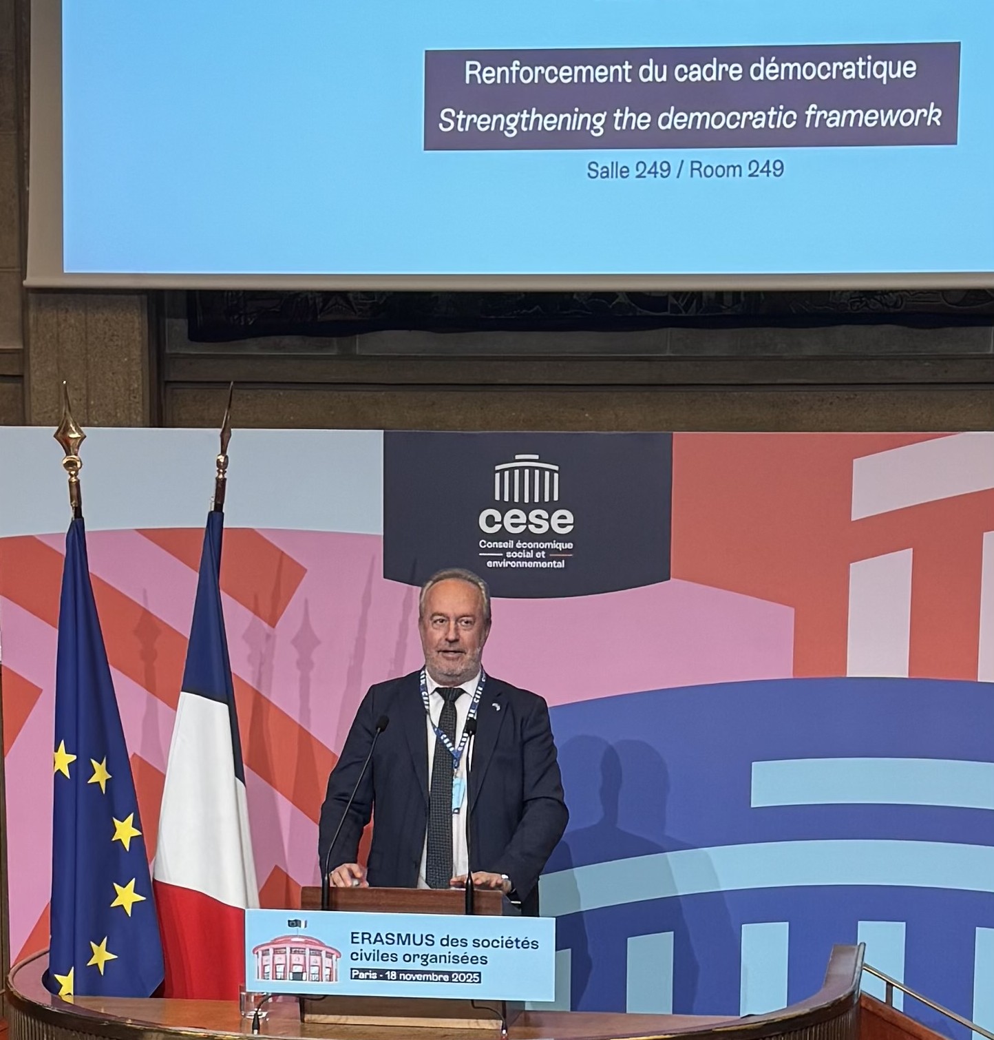 Το Οικονομικό, Κοινωνικό και Περιβαλλοντικό Συμβούλιο της Γαλλίας, στο πλαίσιο της 6ης Συνάντησης του Project «Erasmus της οργανωμένης κοινωνίας των πολιτών», διοργάνωσε στο Παρίσι, στις 18 Νοεμβρίου 2025, εκδήλωση με θέμα «Η Κοινωνία των Πολιτών και τα Οικονομικά και Κοινωνικά Συμβούλια στην πρώτη γραμμή για την προστασία της ευρωπαϊκής δημοκρατίας».